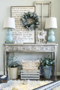 Today I’ll be sharing our entryway with you. It is one of my favorite spaces to decorate for the seasons. For this year’s holiday entryway, I really just rearranged a few pieces that were already on the table, added a new wreath and some reindeer, and called it a day. I wanted the wreath to look like it was floating in the middle of the arrangement, so I used fishing wire to hang it.